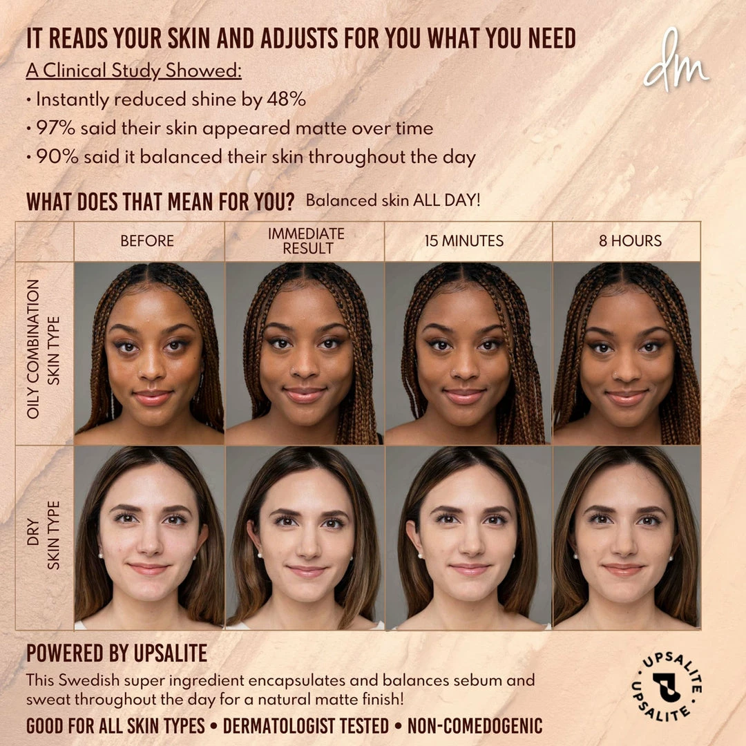 A texture reducing, coverage boosting, blurring balm that balances oils throughout the day while maintaining hydration. Powered by Upsalite a Swedish super ingredient that encapsulates and balances sebum and sweat throughout the day for a natural matte finish.
