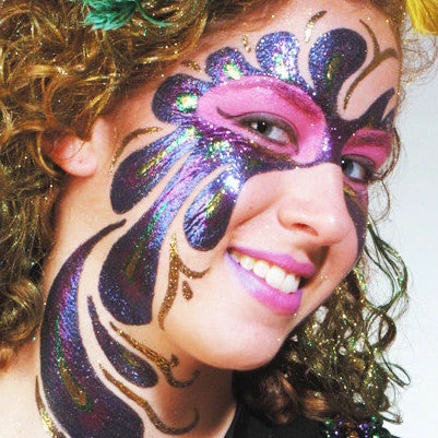 Dancers, Mardi Gras spectators and masqueraders can all feel free to create their own unique designs with just one kit. Simply paint on the latex, allow it to go untouched until completely dry, and press on powder shimmer or glitter. These designs will stay stunningly gorgeous for hours until you peel them off!