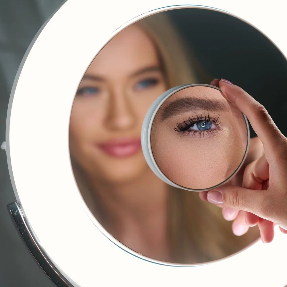 Whether you’re inserting contact lenses, plucking eyebrows, or want to perfect your eye makeup, you’ll be amazed at how much detail you can see when using the Ilios Lighting 10x Mirror. The mirror attaches to the Beauty Ring’s 1x mirror using the built-in magnets.