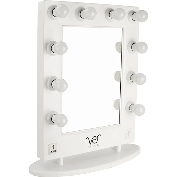 The Just Case Vanity Mirror is crafted of durable and high quality material with a pink matte metal body and base for table top setups. Ten dimmable LED bulbs provide the perfect brightness for makeup application. Comes with front mounted power outlet for charging all your beauty accessories.