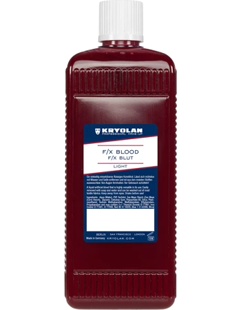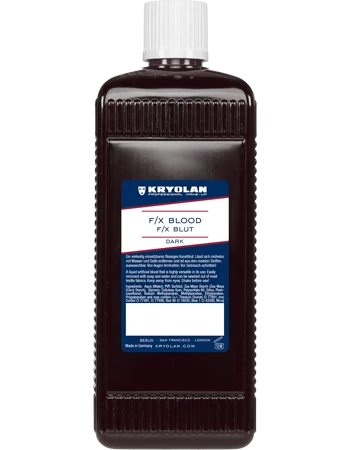 Kryolan F/X Blood is a liquid artificial blood that is highly versatile in its use. It dries completely on the skin and is then smudge proof and does not stain. Though its own sheen, however, it still makes a fresh and moist impression. This type of blood is available in two color s light and dark. F/X Blood is easily removed from skin with soap and warm water. It can also be washed out of most textile fabrics.