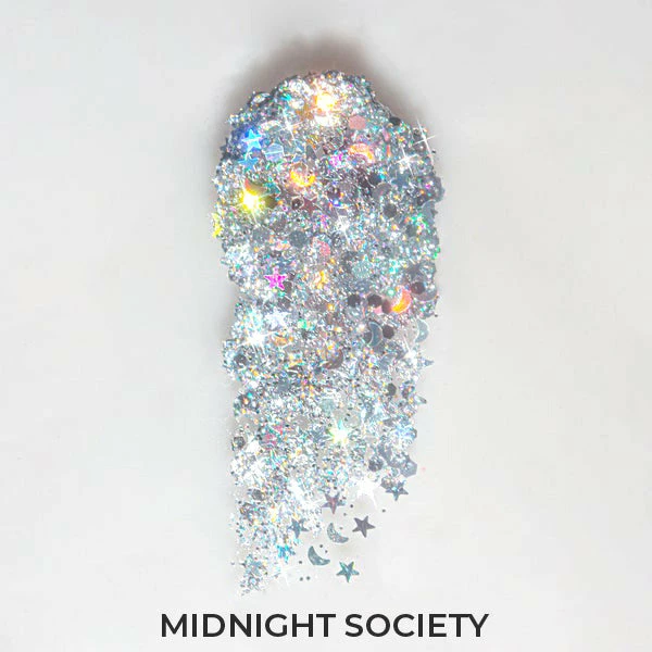 Midnight Society – Heavy metal blend featuring multiple shades and sizes of holographic silver moons and stars with a subtle cool undertone.