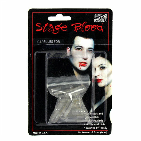 Mehron Blood Capsules are clear, edible capsules used for fake blood FX. Fill with Mehron Stage Blood and bite down for dripping blood FX.