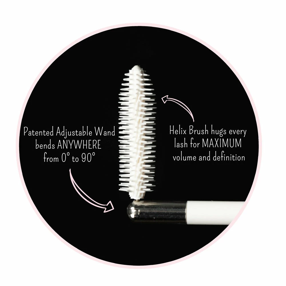 Volumizing VEGAN mascara featuring innovative adjustable brush and lash-feeding formula infused with amino acids, argan oil, and red algae extract. Long-lasting and smudge proof.